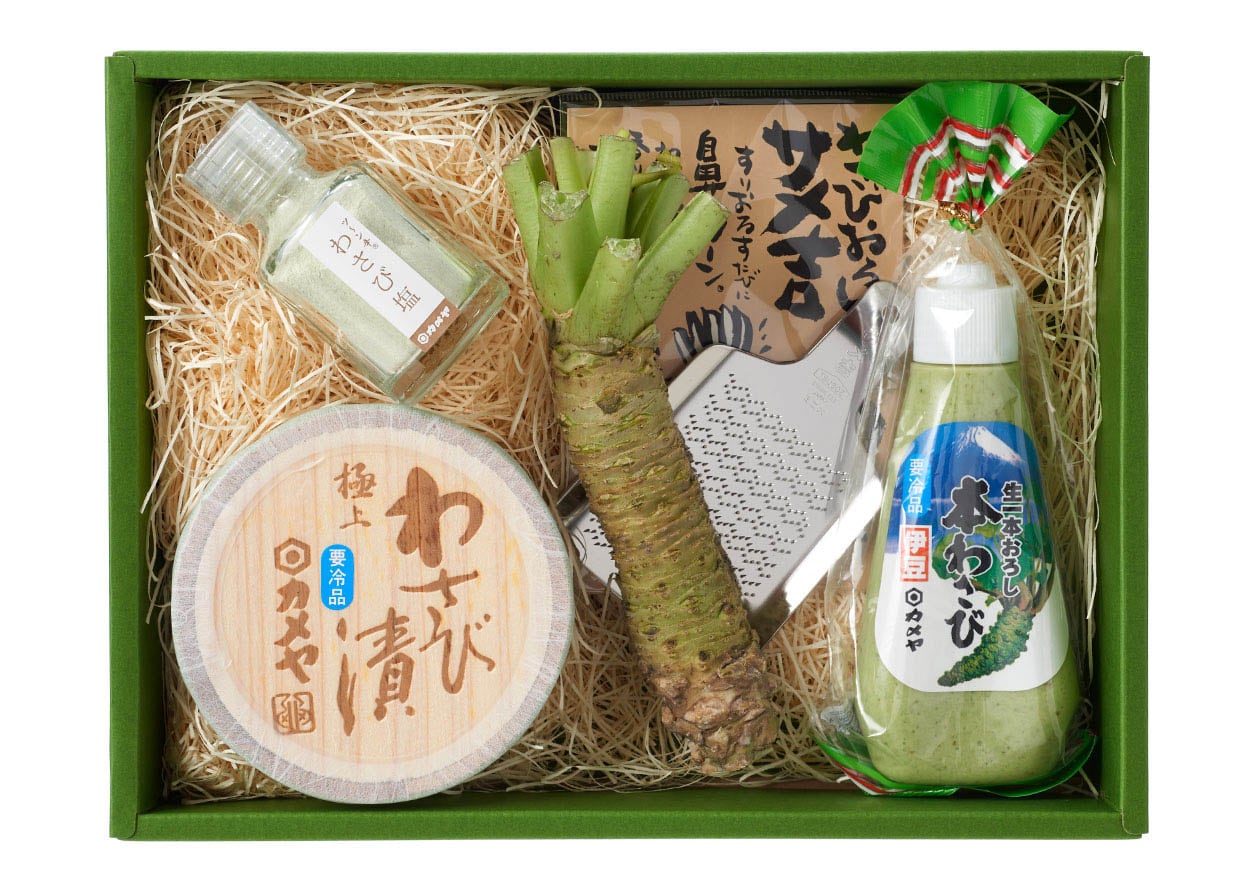 | 原材料 | 【根わさび 1本】 【極上わさび漬 100g】わさび、漬け原材料(酒かす、砂糖、食塩)/調味料(アミノ酸)、香辛料抽出物 【生一本おろし本わさび 170g】本わさび(静岡県産)、食物せんい、でんぷん、食塩/ソルビット、環状オリゴ糖、香料、酸味料、香辛料抽出物、着色料(黄4、青1)、(一部に大豆を含む) 【わさび塩 45g】食塩(国内製造)、マルトース、昆布粉末、わさび(静岡県産)/環状オリゴ糖、香料 |