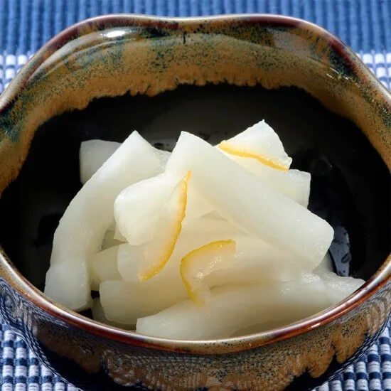 色白の身の締まった大根に、ゆずをのせて漬けました。袋を開けたとたんにさわやかな香りが漂う、見た目も上品なお漬物です。カメヤのお漬物の中でも一、二を争う人気商品として、大人から子どもまで幅広い層から愛されています。